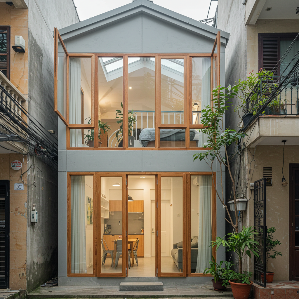 Ngôi nhà phố với phong cách tối giản, nhẹ nhàng kèm tông màu xám chủ đạo làm nổi bật khung cửa gỗ kính và không gian ngập tràn ánh sáng.